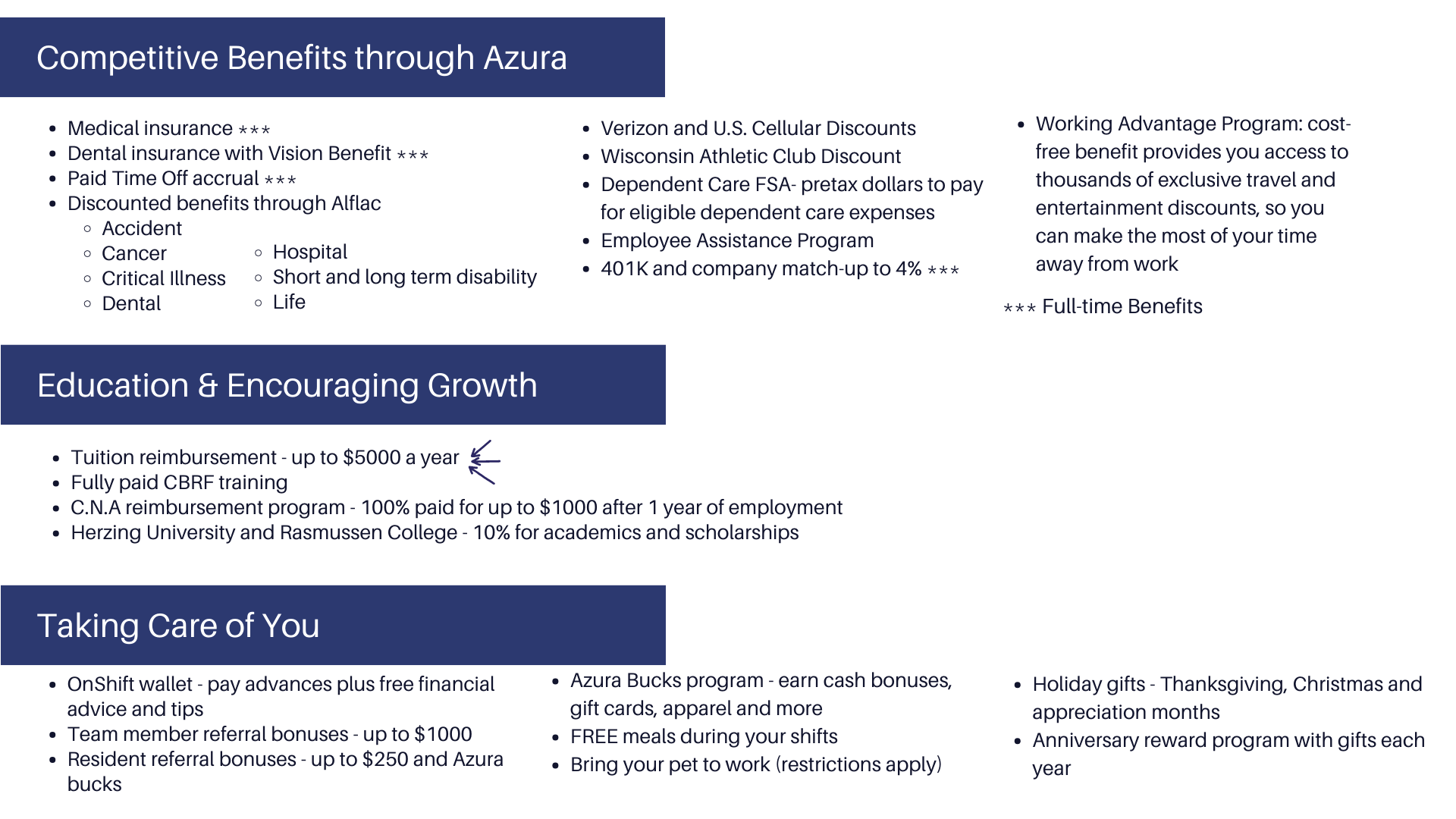 Azura Palliative Care and Hospice is raising the bar in Wisconsin with innovative services, creative therapies, and compassionate relationships. Our team is dedicated to providing exceptional care, and we ensure that every team member receives the education, resources, and support needed to excel in their role. With ample opportunities for career recognition and growth, we are committed to fostering a culture of excellence and compassion in caregiving. At Azura, we don’t just provide care—we elevate the entire experience for both patients and caregivers alike.